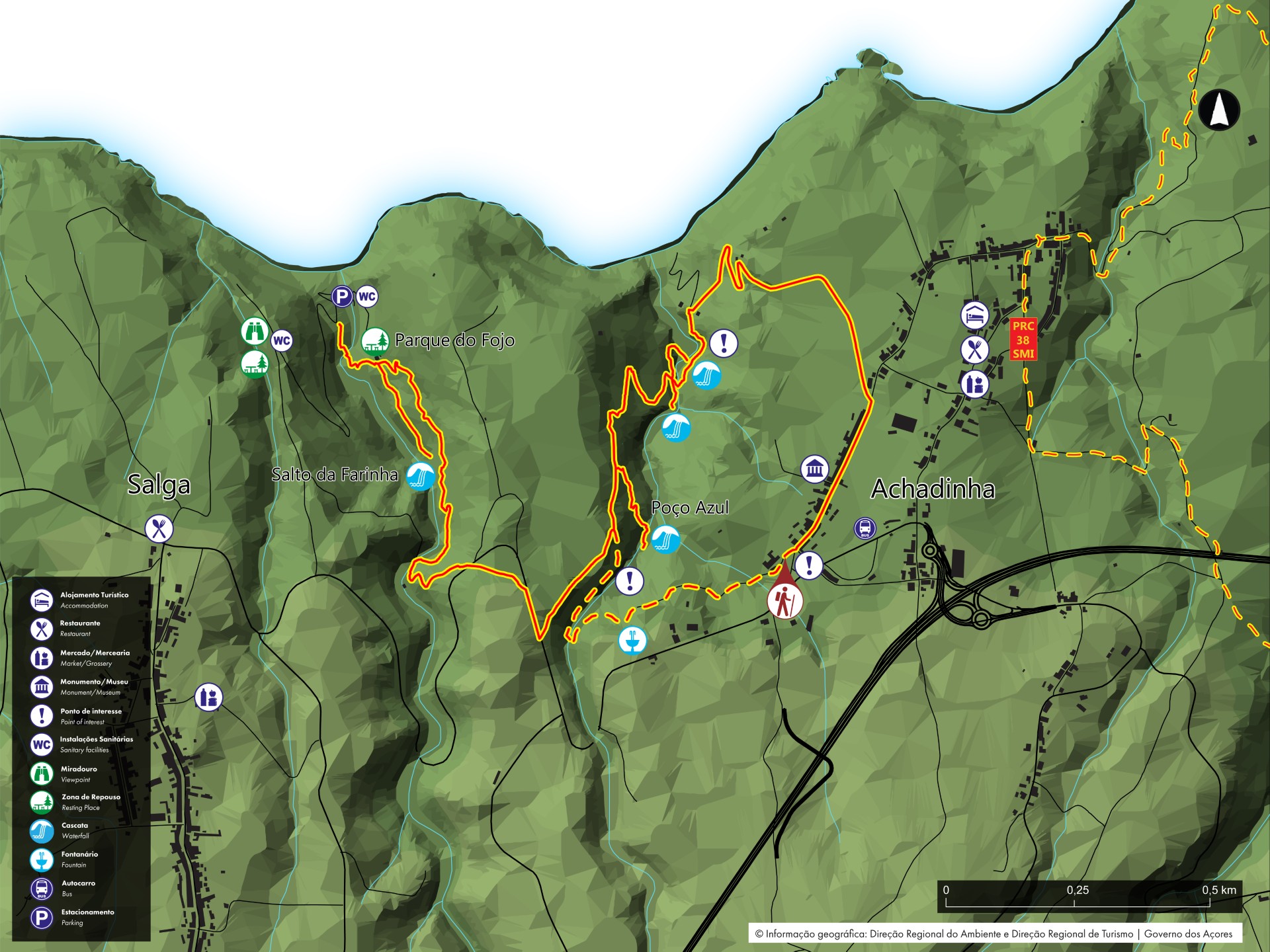 Right after starting the trail, you will find Casa João Melo, dedicated to the life and work of the Azorean writer and the preservation of local culture. Heading toward the area of Risco, the trail follows a “levada” that once supplied an old watermill and passes through an area marked by several waterfalls. During the hillside ascent, you can take a detour to Poço Azul, a place of singular beauty and one of the landmarks of Achadinha.