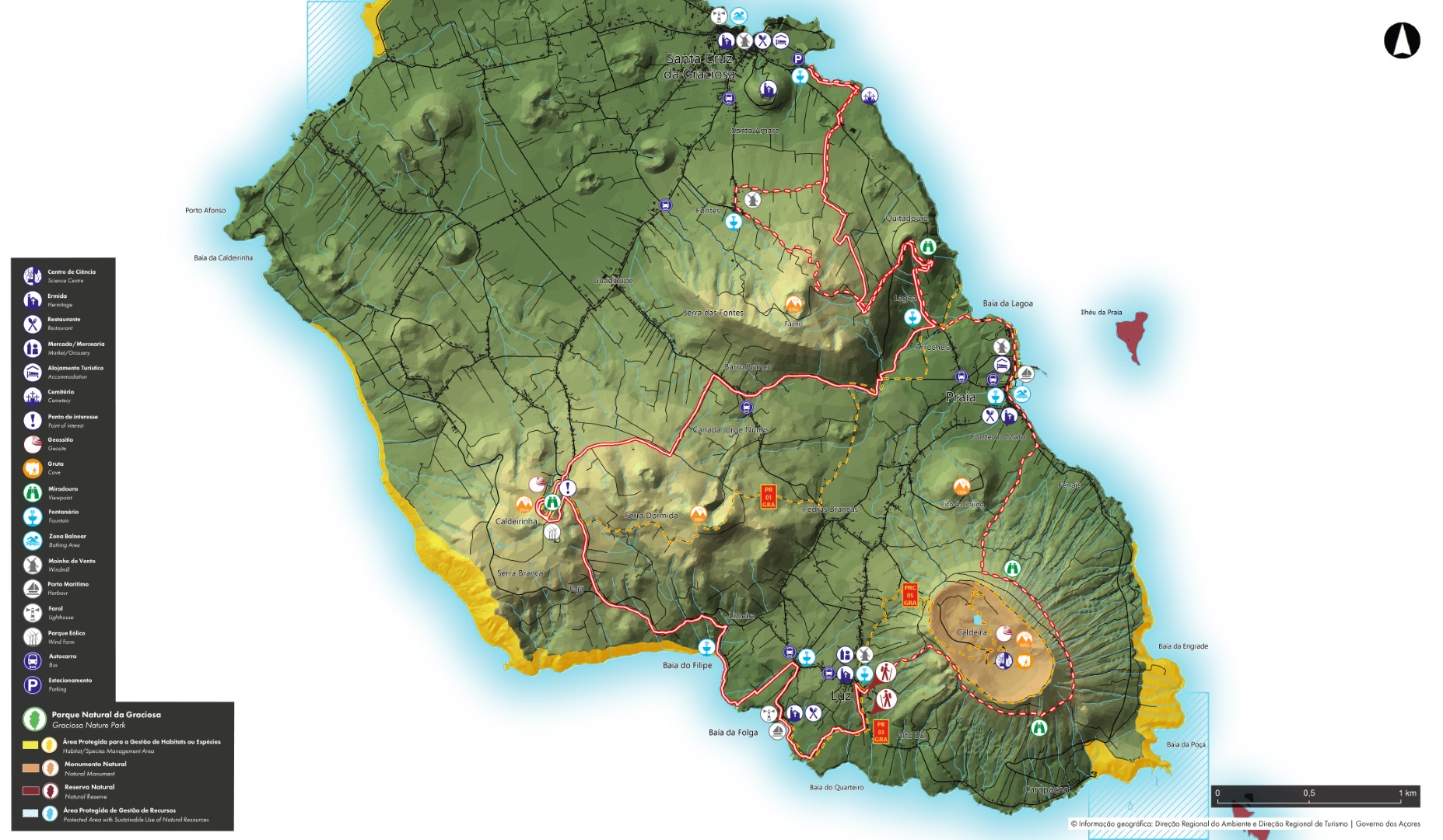 The Great Route of Graciosa covers much of the island through a circular trail that alternates between coastal landscapes, especially several islets, and the inland volcanic landscapes over a total length of approximately 40 km.