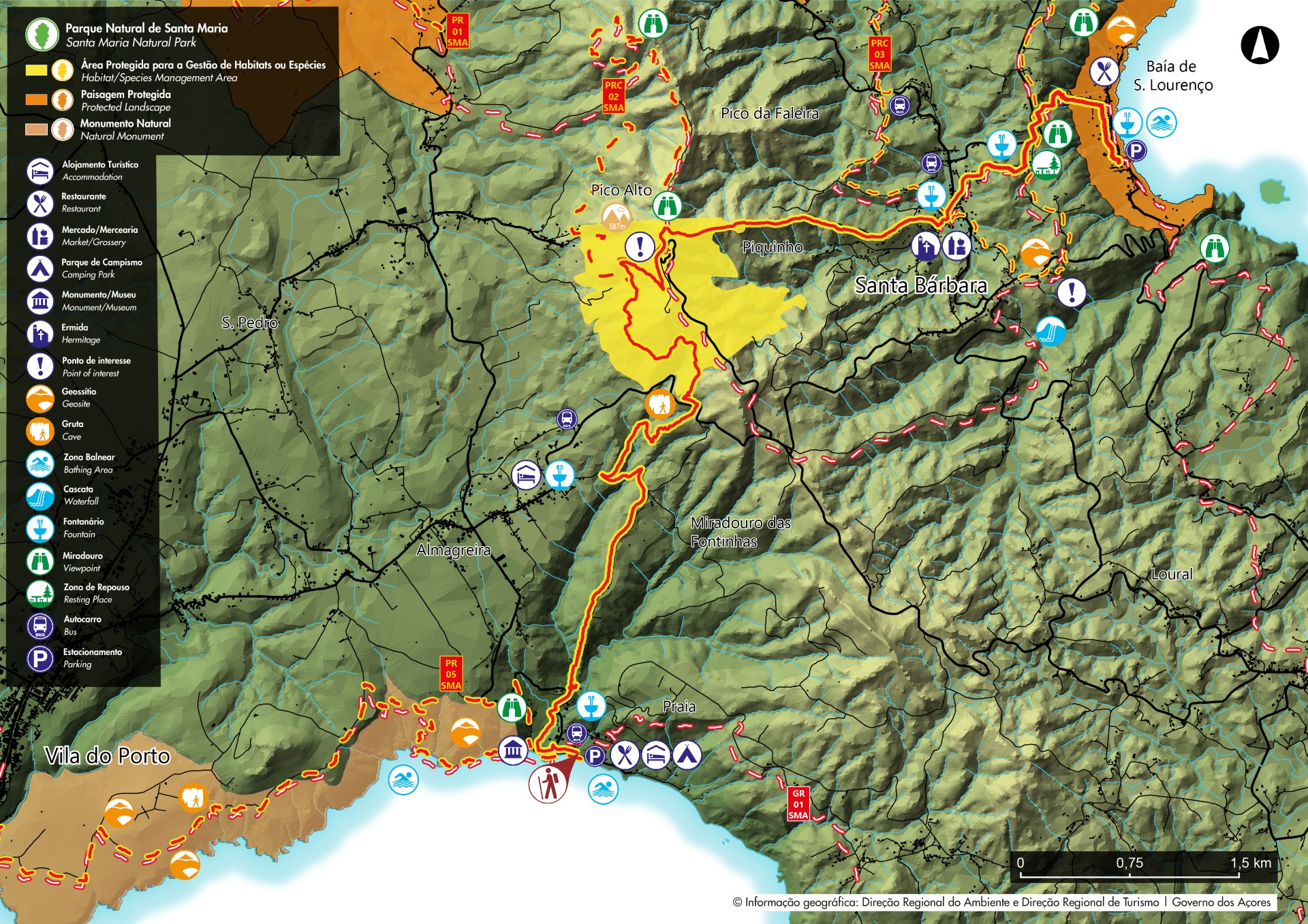 Along this trail, you will cross classified areas such as the protected area for management of species or habitats of Pico Alto and the protected landscape area of Baía of São Lourenço.