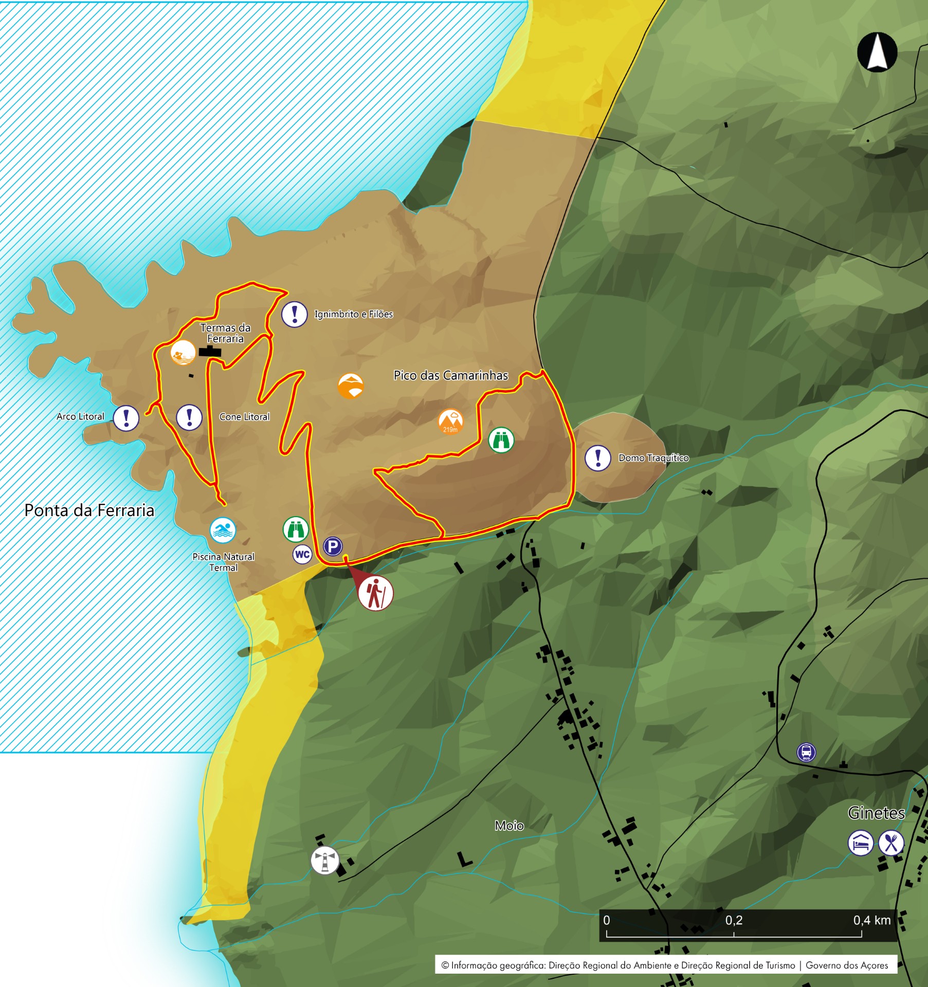 Begin the trail towards Pico das Camarinhas, a cone of basaltic slags, where you should go up by a dirt road towards the top. Here, there is a wide view either to Ponta da Ferraria as well as to the village of Ginetes and Pico do Cavalo. From here, it is possible to see the alignment of three craters with west-east general orientation, typical of a fissure volcanism. Ahead, you should walk down the trail, going around the two coalescence craters and arriving to Caminho Velho, you should turn right where it is possible to see a trachytic dome. Reaching the crossroad you should turn right again through the street, Rua Ilha da Sabrina, towards the lava cliff of Ferraria.
