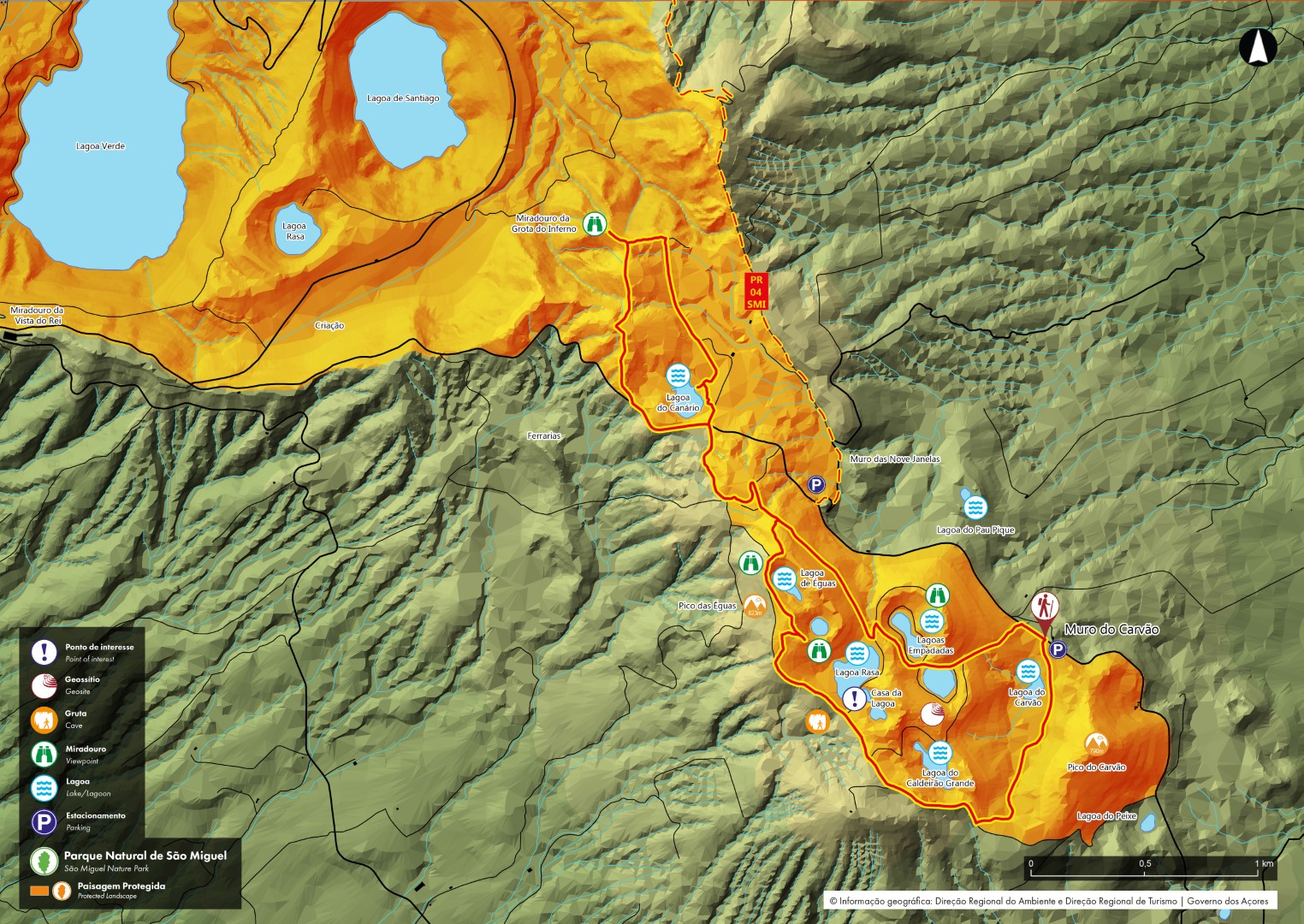 This trail develops through an area of high ecological and landscape value, characterized by several lakes and wetland habitats typical of Wetlands zones, such as Lagoa do Carvão, Lagoa do Caldeirão Grande – currently waterproofed and used for agricultural supply –, Lagoas do Caldeirão Pequeno (North and South), and Lagoas Empadadas. The trail also ascends Pico das Éguas, one of the most prominent elevations in the area, reaching about 873 meters above sea level, where are located the North and South Éguas Lake – the highest-altitude lakes on São Miguel Island – offering expansive views of the surrounding landscape.