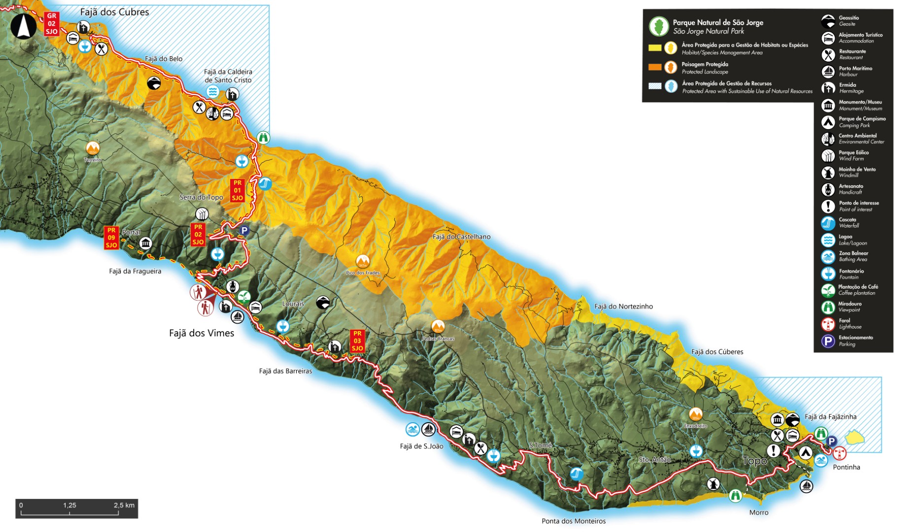 El GR01 SJO Gran Recorrido de São Jorge 01 recorre perceptiblemente la mitad de la isla, trazando un recorrido lineal que une el extremo este de la isla de Topo, hasta Fajã dos Cubres en la costa norte y cuenta con una extensión total de 40 km.