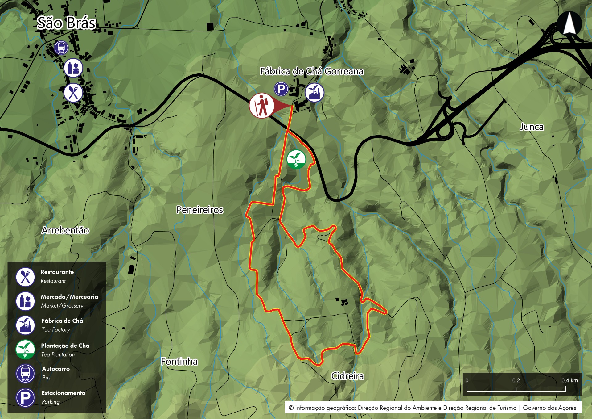 Siga la señalización y deje atrás el camino principal que sube por la izquierda, siguiendo por un camino de tierra estrecho que desciende. Este camino utilizado en los tiempos de las cosechas por los trabajadores de la fábrica, continua hacia abajo entre las plantaciones hasta la fábrica de té, en la que termina el recorrido.