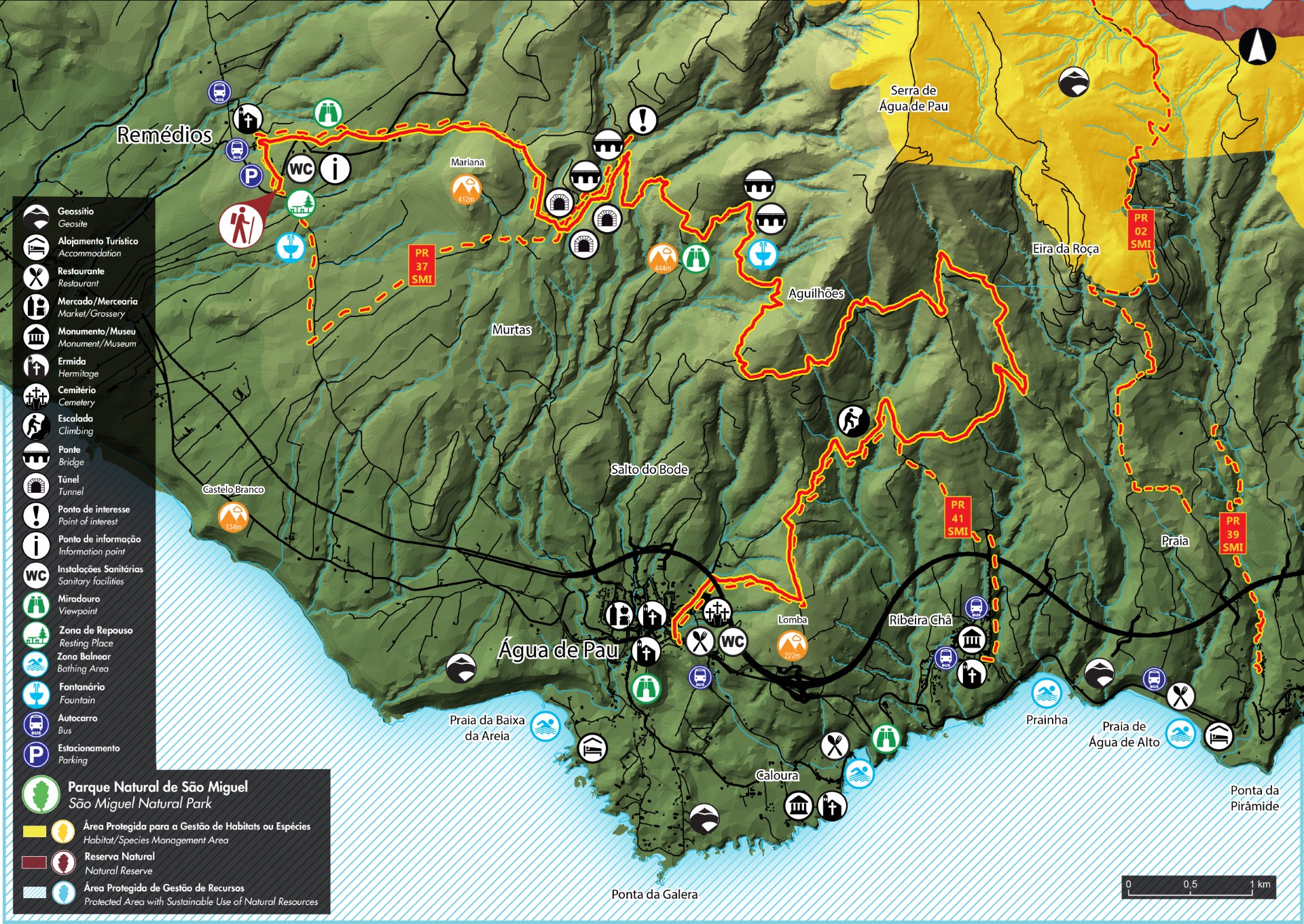 This linear route connects the place of Remédios to the village of Água do Pau, through ancient roads used by the watermen, taking the water to the parish of Lagoa. The trail crosses several resources connected to this line of activity such as old bridges, aqueducts, clay pipelines, levadas (watercourses) and some tunnels. To cross the tunnels, it is advisable the use of lanterns and before starting the trail be sure you are suitably equipped. Along the trail, it is necessary to pay special attention for the presence of animals that should not be disturbed. This trail shares legs with other trails therefore pay attention to the signaling marks.