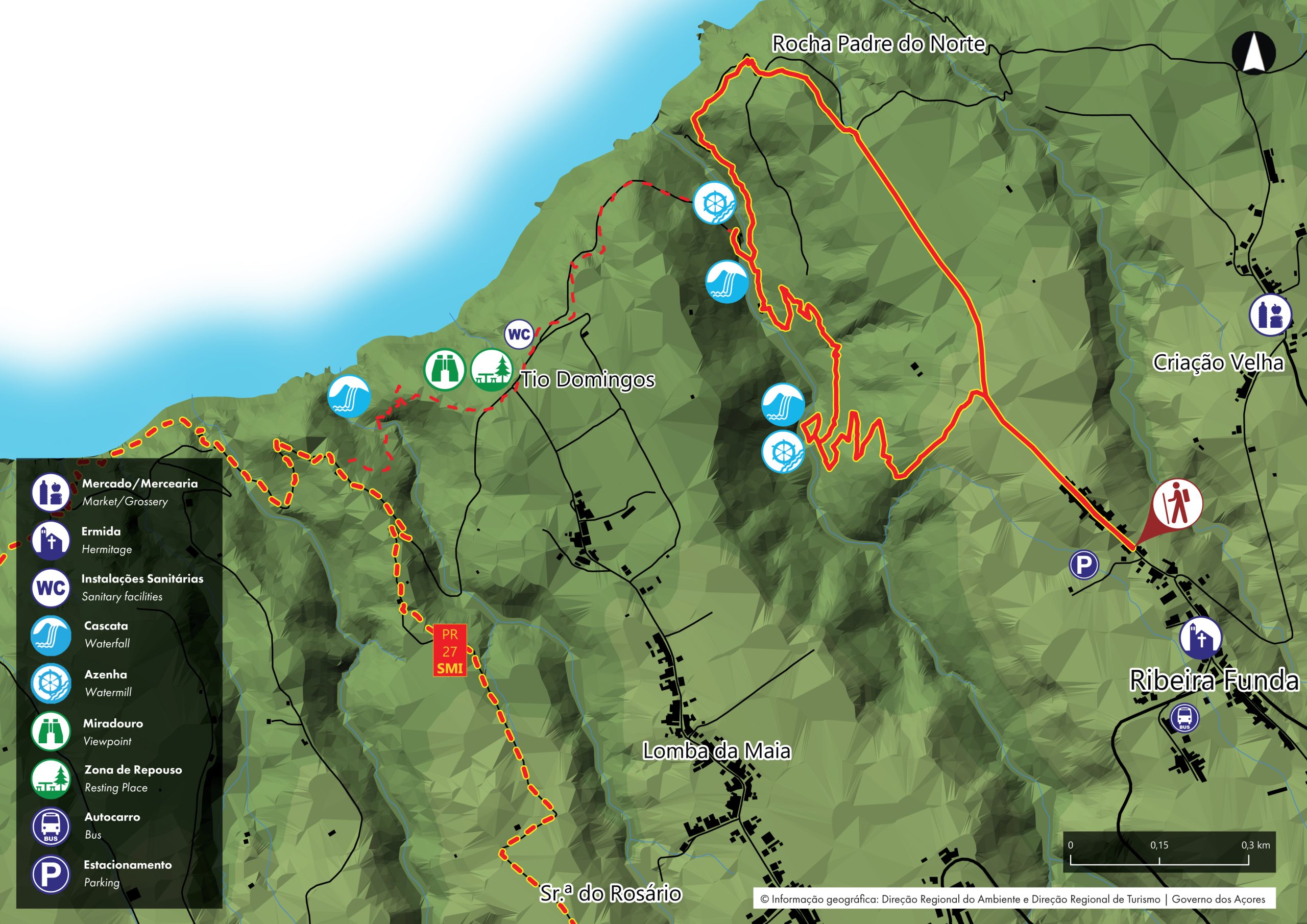 Cette route circulaire du lieu-dit Ribeira Funda (Fenais da Ajuda), débute auprès de la chapelle de Nossa Senhora da Aflição. Descendez la rue asphaltée jusqu’à ce qu’elle cède la place à un chemin de terre. À la bifurcation, prenez à gauche sur le bord du pré, jusqu’à entrer dans un bosquet de cryptomerias (Cryptomeria japonica), de pittospores (Pittosporum undulatum), de faias (Morella faya), et de cabaceiras (Pericallis malvifolia), entre autres. On peut voir également quelques espèces d’oiseaux comme le milan (Buteo buteo rothschildi), le merle noir (Turdus merula), le rouge-gorge (Erithacus rubecula) et la bergeronnette (Motacilla cinerea patriciae).