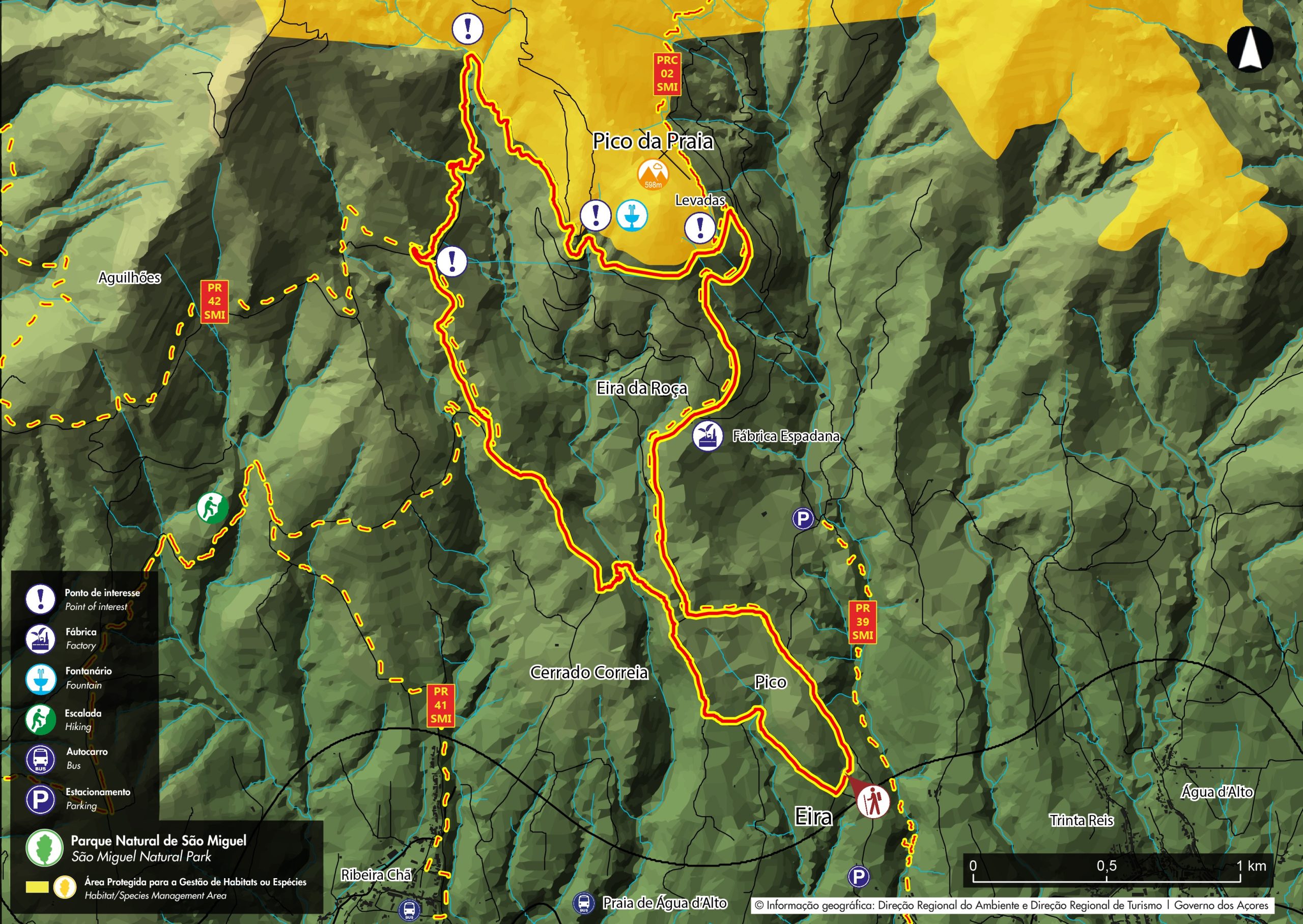 The trail´s name, “Pico da Praia”, comes from an elevation with an altitude of 598m, that results from the accumulation of pumice pyroclasts released by volcano of “Fogo” and strongly moulded by the erosion of the neighbour streams, which stands out from the other elevations for its cryptomeria forest cover. Arriving at a small dam spillway of the hydropower plant “Central Nova”, it is possible to take a detour (5 km roundtrip) through the trail PRC02SMI, following along the “levada” (water conduct) to the south shore of “Lagoa do Fogo”, classified as a Nature Reserve and geosite of the Azores Geopark.