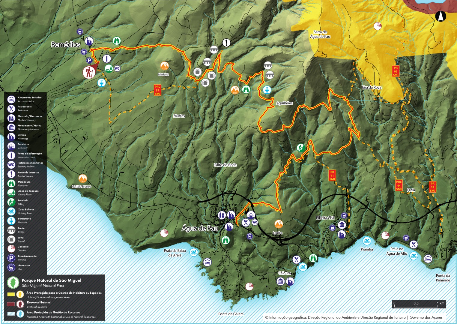 This linear route connects the place of Remédios to the village of Água do Pau, through ancient roads used by the watermen, taking the water to the parish of Lagoa. The trail crosses several resources connected to this line of activity such as old bridges, aqueducts, clay pipelines, levadas (watercourses) and some tunnels. To cross the tunnels, it is advisable the use of lanterns and before starting the trail be sure you are suitably equipped. Along the trail, it is necessary to pay special attention for the presence of animals that should not be disturbed. This trail shares legs with other trails therefore pay attention to the signaling marks.