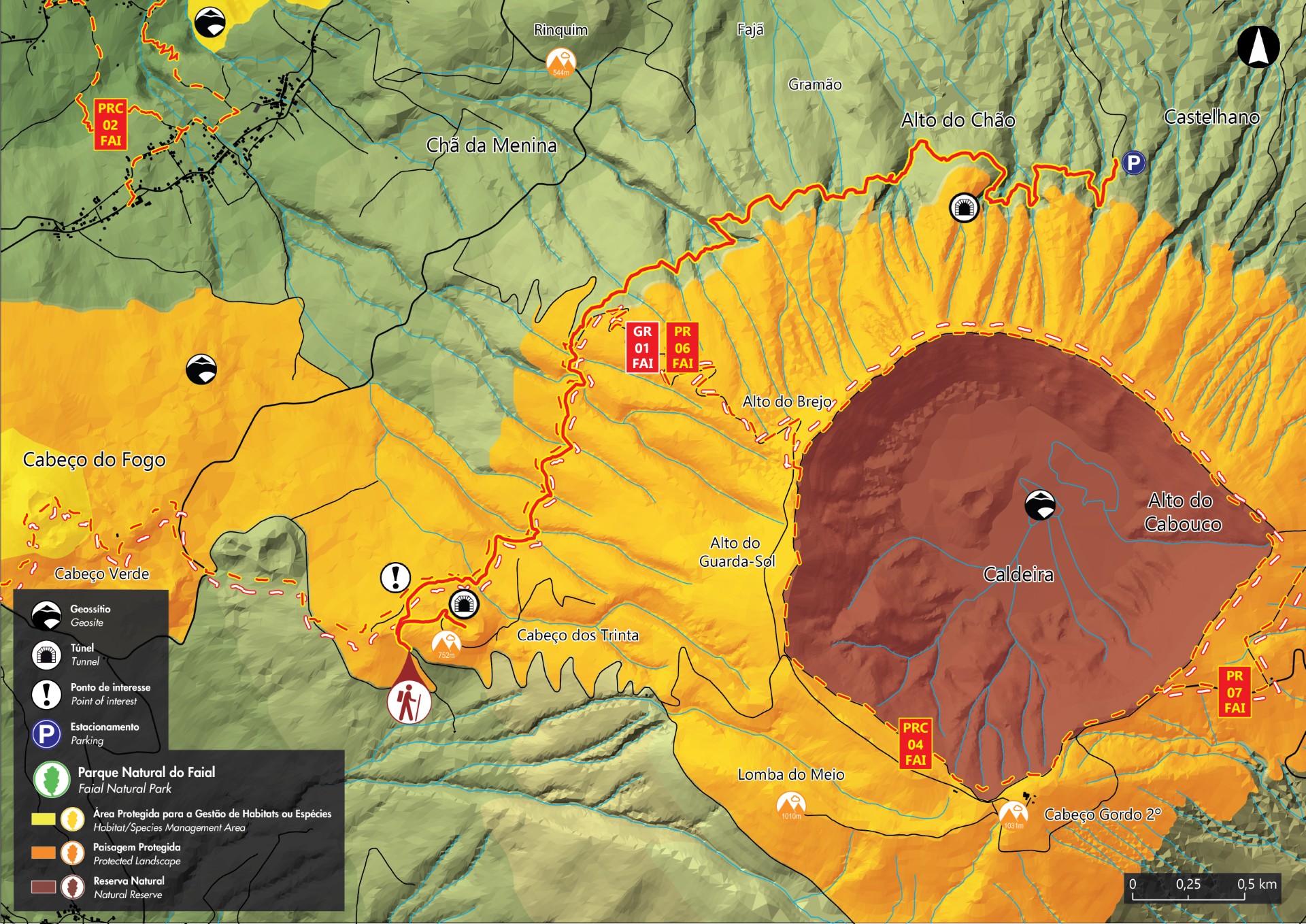 Inserida na Área de Paisagem Protegida da Zona Central, esta rota linear dá a conhecer zonas de grande interesse vulcanológico, como o geossítio da Península do Capelo, e de grande riqueza em espécies de fauna e flora típicas da floresta Laurissilva. Ao longo do passeio, a sinalética varia entre o branco, vermelho e amarelo da interseção de Grande e Pequena Rota e o amarelo e vermelho de Pequena Rota. Os cruzamentos estão devidamente assinalados no local com de setas de sinalização. Inicie o percurso próximo do Cabeço dos Trinta, na freguesia do Capelo. Opte pelo desvio à direita, seguindo até ao túnel de acesso ao interior do Cabeço, um cone vulcânico repleto de vegetação endémica. Retorne pelo mesmo caminho até à estrada de terra e siga à direita até ao tanque de armazenamento de água, que deverá contornar pela esquerda, e continue até encontrar a levada. Considerada como uma das maiores obras de engenharia dos Açores, esta foi inaugurada, em 1964, após 7 de planeamento e 4 anos de construção. Implantada a 680 m de altitude e ao longo de 10 km de extensão (atualmente apenas 8 km podem ser percorridos), tinha como principal função fornecer água para a produção de energia hidroelétrica. A água é recolhida em vários pontos, ao longo do percurso, para depois ser encaminhada para a central mini-hídrica do Varadouro. Por vezes, é possível visualizar o alinhamento dos cones vulcânicos do Complexo Vulcânico do Capelo em clareiras existentes ao longo do percurso. Prossiga por entre a vegetação endémica, como o louro (Laurus azorica), o sanguinho (Frangula azorica), o azevinho (Ilex azorica) e a urze (Erica azorica), entre outras. É também possível avistar algumas aves dos Açores, como o melro-negro (Turdus merula azorensis), a estrelinha-de-poupa (Regulus regulus inermis) e o tentilhão (Fringilla coelebs moreletti). O percurso prossegue acompanhando a levada, intervencionada ao longo de 2 km com obras de recuperação, em 2013, até ao local onde termina a caminhada, no lugar do Alto do Chão, freguesia dos Cedros.