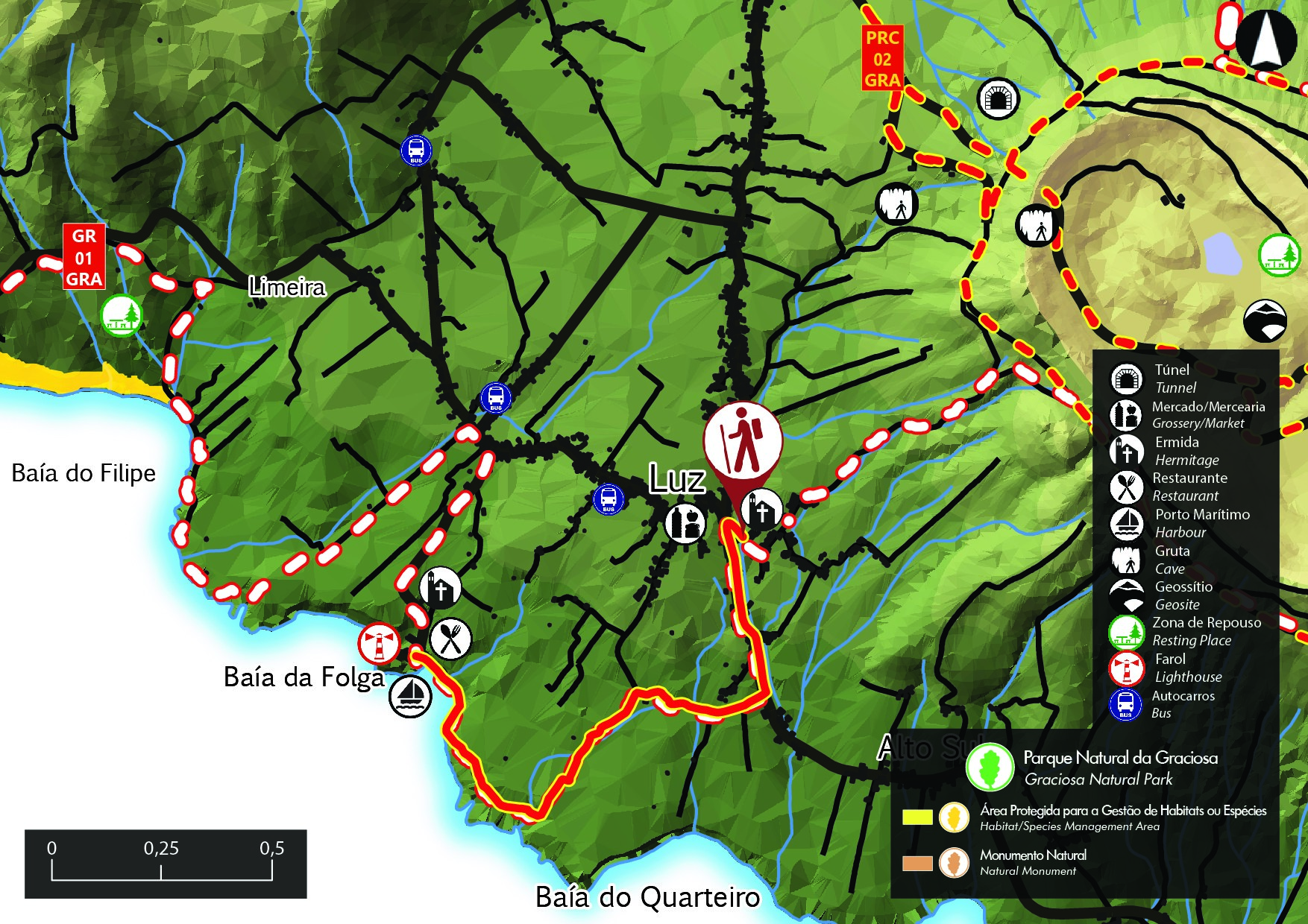 Esta pequena rota, na zona sul da Ilha, permite visitar a Baía da Folga, uma zona balnear perto da Freguesia da Luz, onde começa o percurso. Inicie o trajeto no centro da freguesia, perto da igreja de Nossa Senhora da Luz, e siga pela estrada para o Carapacho, virando à direita, para um caminho de terra batida que dá acesso a campos de cultivo, pastos e, principalmente, “currais” de vinhas. Após as últimas casas, o percurso vira para Sul, rumo à costa, por um caminho de terra. Em dias de boa visibilidade é possível ver, ao longe, as ilhas de São Jorge, do Pico e do Faial. Ao longo do caminho, é possível ver alguns exemplares de tomate-capucho (Physalis peruviana), uma planta com bagas comestíveis de sabor agradável. Chegando à costa, aparecem com maior frequência os cubres (Solidago sempervirens), uma planta costeira com um grande número de flores amarelas, e também a endémica bracel-da-rocha (Festuca petraea), também conhecida por feno-da-rocha, devido aos pequenos tufos que saem da rocha. O percurso termina no porto da Folga, uma pequena zona balnear, onde poderá desfrutar de um mergulho nas águas do Atlântico. Existiu aqui um forte de defesa marítima (séc. XVIII), que não resistiu até aos dias de hoje. Nas imediações, pode ainda aproveitar para visitar a ermida de Santo António e descansar no restaurante local.