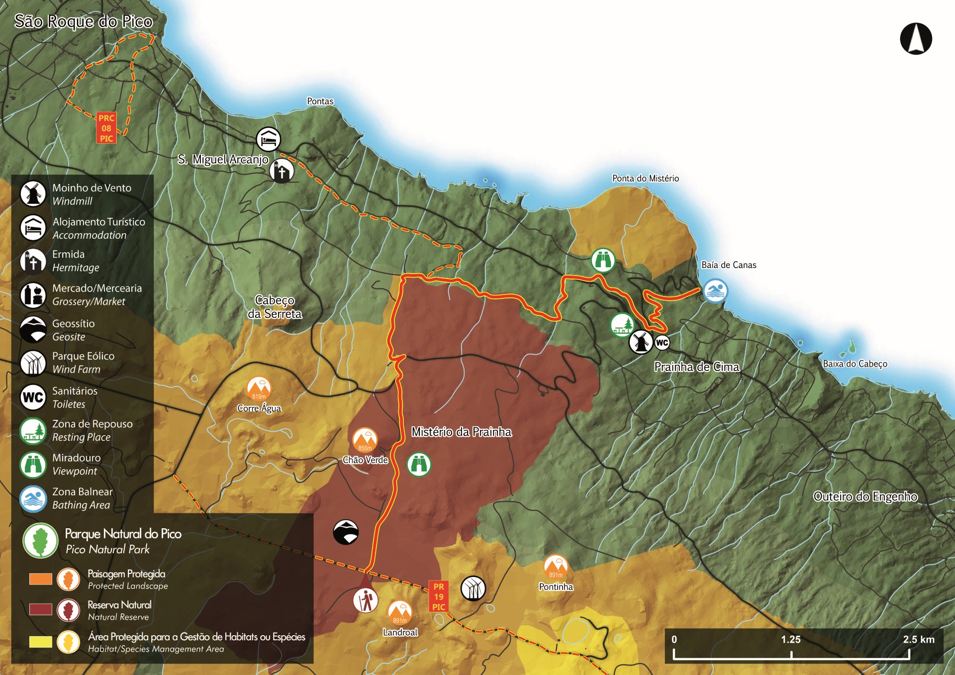Caso escolha o desvio para a Baía de Canas, cerca de 1,7 km depois, vire à esquerda na vereda de incensos (Pittosporum undulatum), acácias (Acacia sp.) e louros (Laurus azorica) que o irá guiar até ao Parque Florestal da Prainha. A partir daqui, siga as marcações e prossiga nos atalhos de terra batida/pedras soltas, até chegar ao ponto final do percurso - a Baía de Canas.