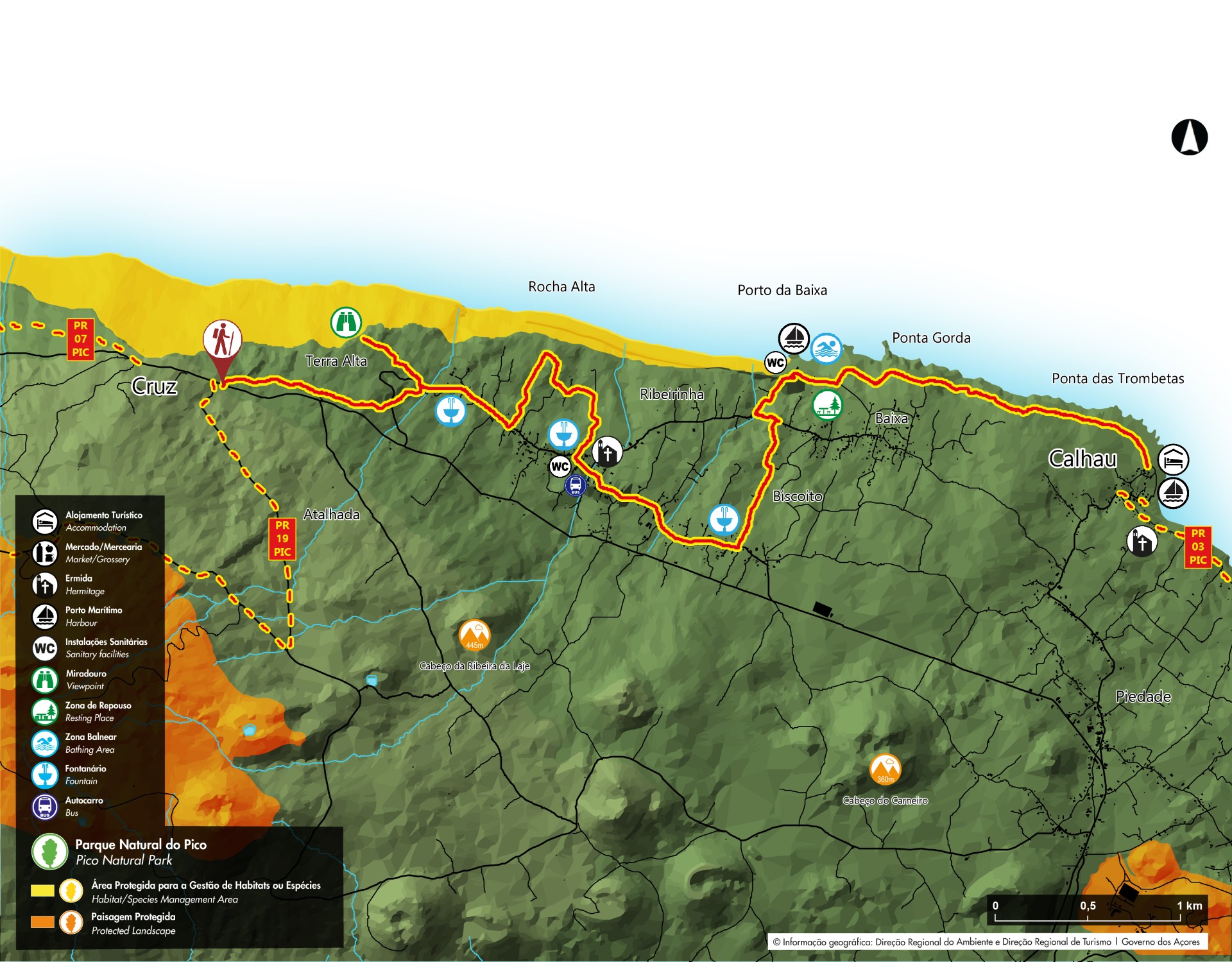 Retorne ao caminho principal, passe um fontanário e volte à esquerda passando pela zona da Rocha Alta. Chegando de novo à estrada atravesse a Ribeirinha e já no final da freguesia desça, à esquerda pela Canada do Mar, para o porto da Baixa, local onde poderá aproveitar para descansar, dar um mergulho e visitar as adegas típicas e currais de produção de vinha - Património Mundial da Humanidade pela UNESCO. Prossiga junto à costa, seguindo as marcas que o conduzem de novo à estrada, por entre Urzes (Erica azorica).