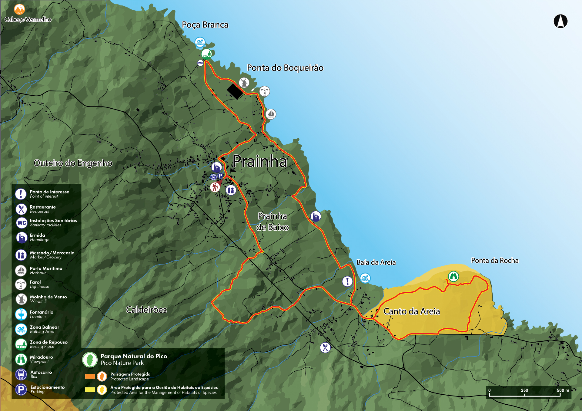 Esta rota circular inicia-se no centro da freguesia da Prainha, no largo Dr. José Machado Serpa, onde se localizam a Igreja de Nossa Senhora da Ajuda, a Junta de Freguesia, a sede da Sociedade Filarmónica, o coreto e o Império do Espírito Santo. A paisagem é marcada por áreas agrícolas, surgindo pequenas quintas, pomares e vinhas com os tradicionais currais erguidos com basalto negro. Associada à cultura da vinha, poderá observar também as adegas, atualmente convertidas em casas de veraneio ou alojamentos de turismo em espaço rural. Junto à Baía do Canto da Areia, o trilho atravessa a antiga área da cultura da vinha do Morro, que, fruto do seu abandono, atualmente se encontra ocupada por matos costeiros de urze (Erica azorica), pau-branco (Picconia azorica) e faia (Morella faya). Esta zona apresenta elevados valores naturais, com espécies de flora e fauna endémicas, sendo uma importante zona de nidificação do cagarro (Calonectris borealis), ave marinha protegida por leis nacionais e internacionais. Está classificada como Área Protegida para a Gestão de Habitats e Espécies ao abrigo do Parque Natural da Ilha do Pico. No miradouro da Ponta da Rocha, poderá desfrutar de belas vistas sobre as freguesias de Santo Amaro e da Prainha. Este trilho apresenta também um rico património cultural edificado: as ruínas de um dos primeiros núcleos habitacionais não só desta freguesia mas também da Ilha; a Casa do Fio, pequena construção onde, outrora, os residentes se reuniam para transformar em fio as pastas de lã cardada, e que também serviu de posto de amarração do cabo telefónico submarino; e a Ermida de São Pedro, onde, no bloco de pedra que serve de base à cruz, se pode observar um rosto humano esculpido. Destacam-se também, ao longo do trilho, as antigas pontes de pedra e as “casas de recolha de pasto”, utilizadas para o arrumo das alfaias, produtos agrícolas ou forragem para os animais. No troço mais costeiro, passa-se por um poço de maré e um moinho de vento giratório, e pode-se usufruir de duas zonas balneares de excelência: o Canto da Areia (um dos poucos areais da Ilha) e a Poça Branca (uma piscina natural de água límpida). Esta pequena rota termina no largo onde iniciou, de onde se poderá avistar a vizinha ilha de São Jorge.