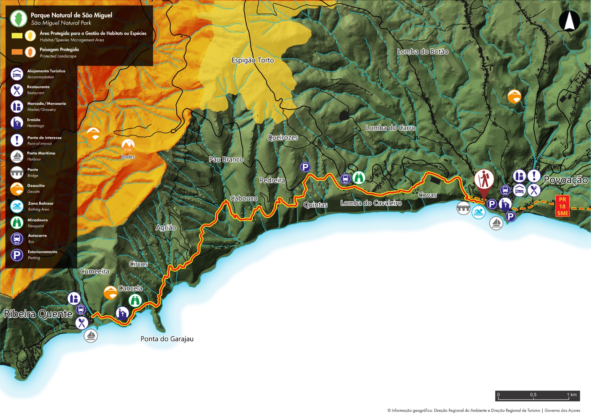 Esta rota linear junto à costa liga a Povoação à Ribeira Quente, passando pela Lomba do Cavaleiro. Este percurso, muito usado antigamente por quem trabalhava as terras produtivas do lugar do Agrião, é também um ponto de passagem das romarias quaresmais ao longo da Ilha. Dê início à caminhada na zona balnear da Povoação e, se as condições o permitirem (mar calmo e areal vazio), siga ao longo da praia, passando pela base da Ponte de Ferro, continuando depois para a estrada. Esta ponte centenária sobre a Ribeira dos Pelames é também um abrigo para vários exemplares de pombo-torcaz-dos-açores (Columba palumbus azorica). Em caso de mau tempo ou preia-mar, opte pela subida ao longo da estrada e, após a ponte, faça um desvio à esquerda para a ribeira. De volta ao caminho principal, suba ao longo da estrada (EN1-1A) até encontrar um desvio à esquerda para a Lomba do Cavaleiro. Deste atalho, aproveite para apreciar a vista para a Tronqueira/Graminhais. Chegando ao segundo painel, o percurso abandona a estrada e desce por um caminho de terra até à Ribeira do Agrião. Atravesse a ribeira com cautela, especialmente após dias de chuva. Continue, agora em fase ascendente, por uma mata, composta maioritariamente por incensos (Pittosporum undulatum) e acácias (Acacia melanoxylon), entre outras. O itinerário prossegue paralelo à costa, rumo à Ribeira Quente, cruzando a Ponta do Garajau (propriedade privada), um miradouro de onde (em dias de boa visibilidade) é possível avistar a ilha de Santa Maria e a Ermida de Santa Rita. Termine a caminhada junto ao porto da Ribeira Quente e aproveite para explorar esta freguesia.