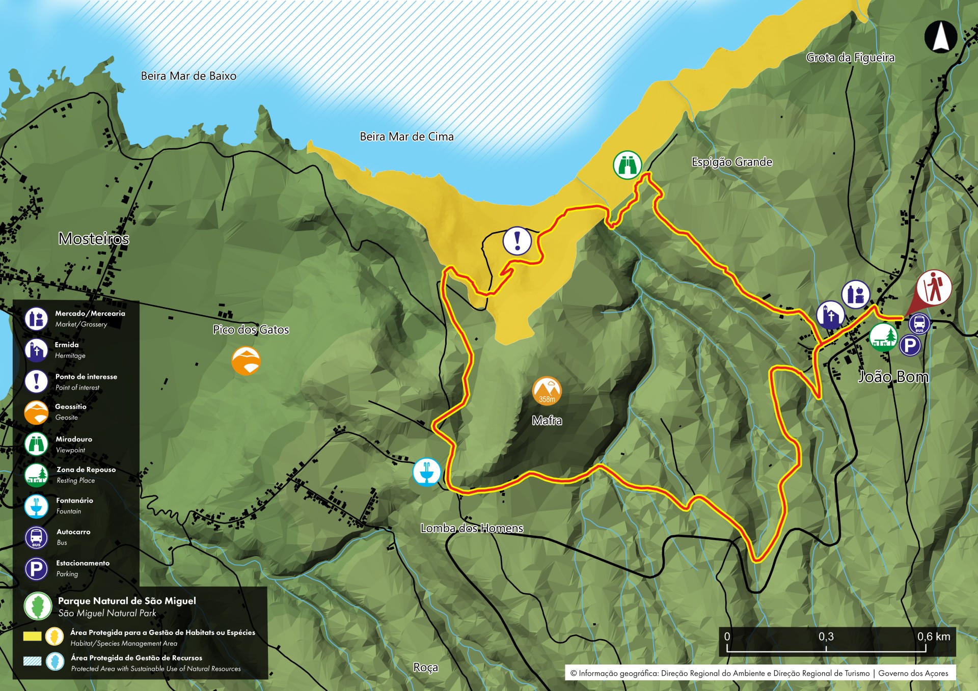 Esta rota circular no noroeste da Ilha, no lugar do João Bom (Pilar da Bretanha), inicia-se na Estrada Regional, numa área de repouso. Desça ao longo da rua e siga a sinalética à esquerda, passando por um minimercado. Um pouco mais à frente, tem uma ermida do seu lado esquerdo e depois a Rua da Relvinha à direita, por onde deverá seguir. Nesta fase do percurso, irá caminhar em direção à costa, por um caminho de terra que dá acesso a campos de cultivo e pastoreio. Siga as marcas até chegar a um portão – que deverá abrir e voltar a fechar –, que dá acesso a um miradouro com vista para o noroeste da Ilha. Continue ao longo de uma mata, passando por um desvio para um novo miradouro com vista para a freguesia dos Mosteiros. Desça ao longo do caminho, onde poderá observar algumas espécies de flora endémica, como a urze (Erica azorica), a malfurada (Hypericum foliosum), a erva-leiteira (Euphorbia azorica) e o pau-branco (Picconia azorica). Classificada como Zona Importante para Aves, também poderá observar milhafres (Buteo buteo rothschildi), pombos-da-rocha (Columba livia) e tentilhões (Fringilla coelebs moreletti), entre outros. O trilho continua até uma zona de captação de água, onde pode aproveitar para descansar. Daqui, suba ao longo do caminho de terra, em direção ao João Bom, aproveitando a posição elevada para apreciar a vista sobre as freguesias da Bretanha e dos Mosteiros. Ao longo da subida, irá contornar o Pico de Mafra – à sua esquerda. Ao chegar ao cruzamento, irá encontrar uma fonte, onde deverá seguir à esquerda, ao longo de um caminho de terra, até ao ponto inicial do percurso.