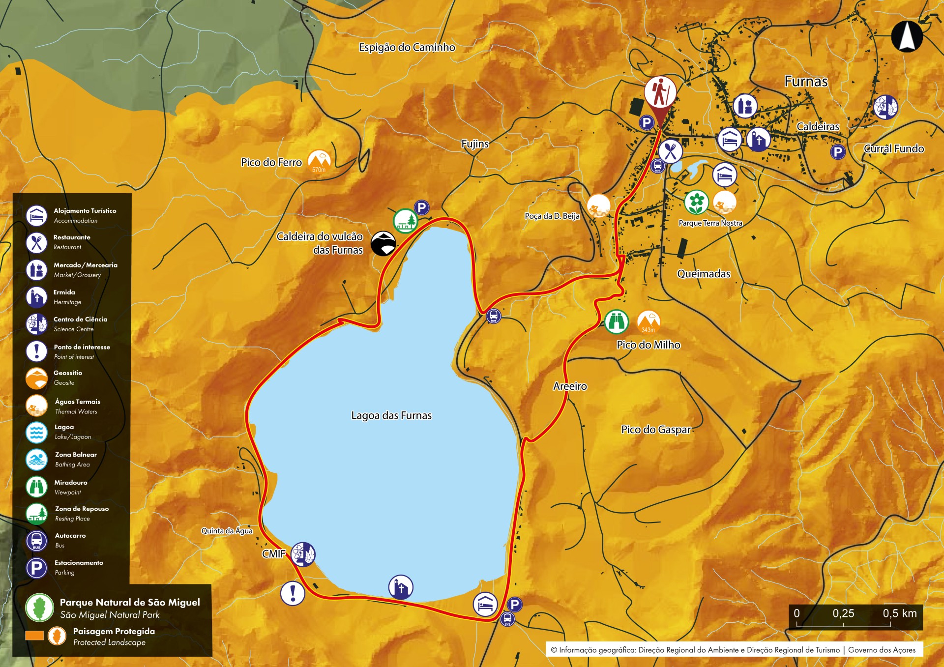 Esta rota circular pelas Furnas, tem início no parque de estacionamento à entrada da freguesia, junto ao Largo das Três Bicas.Siga a sinalética ao longo da vila, passando pela Igreja de Santana e pela Poça da Dona Beija, até chegar a um cruzamento onde deverá seguir em direção ao Pico do Milho. Do topo desta elevação é possível desfrutar da vista para o vale da Furnas.Prossiga ao longo da estrada até chegar à Lagoa das Furnas e siga à esquerda, pela calçada de pedra, contornando o perímetro da lagoa. Ao longo deste caminho irá transpor a Ermida de Nossa Senhora das Vitórias, uma construção gótica do séc. XIX, a Mata Jardim José do Canto e a Casa dos Barcos (Turismo Rural). Adiante encontra-se o Centro de Interpretação Ambiental das Furnas e a área envolvente com diversas zonas de lazer, ruínas de antigos fornos para produção de carvão e ainda a maior araucaria (Araucaria heterophylla) classificada da Europa.Siga o percurso ao longo da margem da lagoa, através de um caminho de terra plano, muito acessível, ao longo do qual é possível ver várias esculturas em madeira e siga até ao recinto das Caldeiras. Este local, devido à atividade geotermal, proporciona um dos cartazes turísticos da ilha onde é cozinhado o tradicional Cozido à Portuguesa com recurso ao calor interno do vulcão das Furnas.Depois de apreciar este cenário, continue passando pelo cruzamento para o miradouro do Pico do Ferro e pela zona das bilheteiras até chegar à estrada regional, onde deverá seguir à esquerda. Avance, com cautela, ao longo da estrada até chegar ao centro da freguesia, local onde termina o passeio.