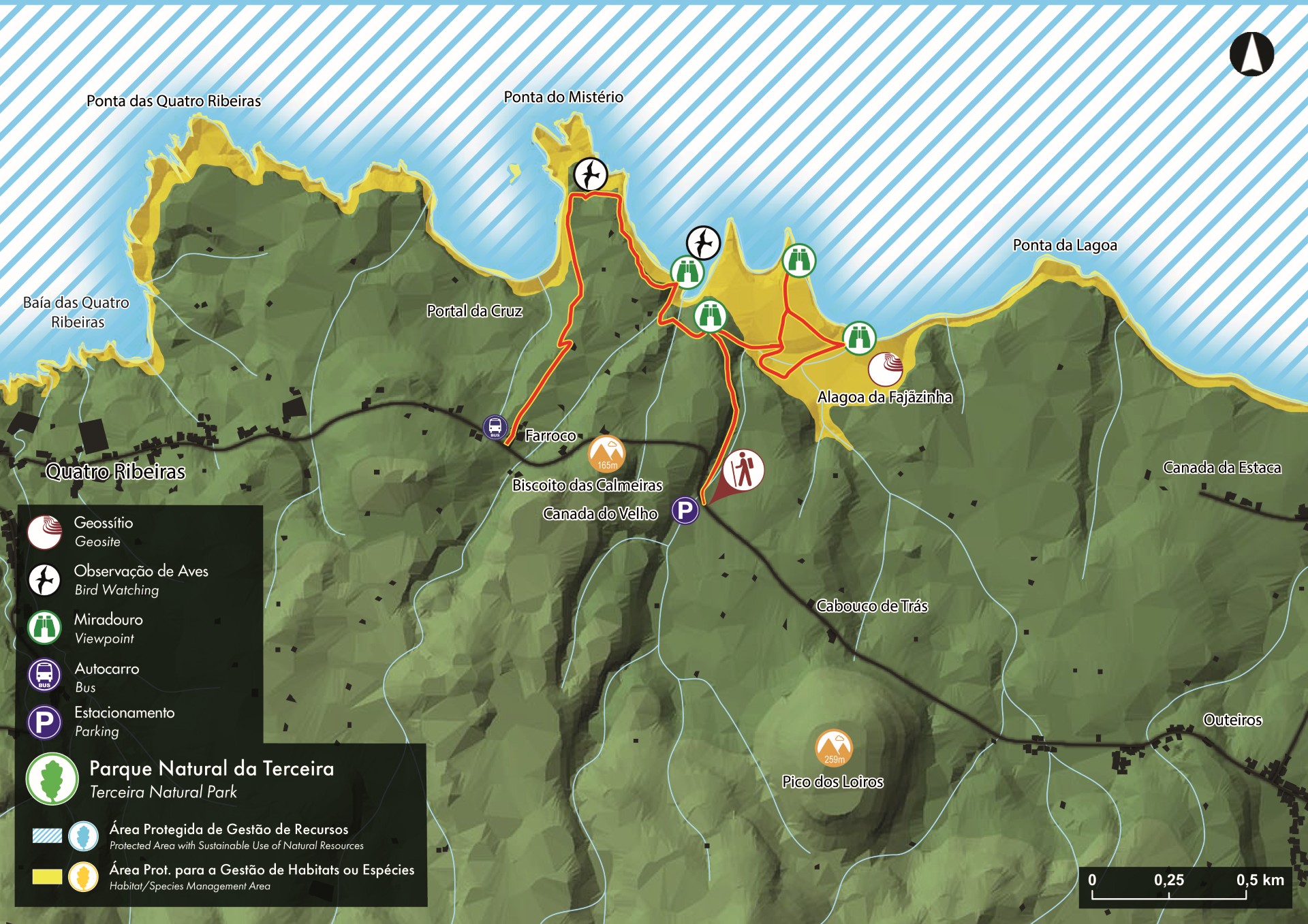 Esta pequena rota linear desenvolve-se ao longo da costa norte da Ilha, entre as freguesias da Agualva e das Quatro Ribeiras, integrada maioritariamente em área protegida do Parque Natural da Terceira, classificada como Área Protegida para a Gestão de Habitats ou Espécies. O percurso tem início na canada da Alagoa, junto ao parque de estacionamento, começando-se por descer em direção ao geossítio da Alagoa da Fajãzinha, também conhecido como Fajã da Alagoa, que corresponde a uma antiga baía preenchida por sedimentos transportados pelo curso de água que ali desagua (Grota da Alagoa), demarcada litoralmente por uma praia de calhaus rolados. Para oeste deste geossítio, e ao longo do trilho, é possível avistar diversas baías com altitudes máximas de cerca de 70 m, arribas com disjunção colunar ou prismática e arribas fósseis de natureza traquítica, que compreendem materiais associados à atividade eruptiva da Ilha nos últimos 23 mil anos. Na vegetação das falésias, destaca-se a presença de variadas espécies endémicas, como a Spergularia azorica, a urze (Erica azorica), a labaça-das-ilhas (Rumex azoricus) e a emblemática vidália (Azorina vidalii). Relativamente à avifauna, é possível observar cagarros (Calonectris borealis), garajaus-comuns (Sterna hirundo) e, ocasionalmente, garças-reais (Ardea cinerea), pilritos-das-praias (Calidris alba) e borrelhos-de-coleira-interrompida (Charadrius alexandrinus). Por se desenvolver maioritariamente em área protegida – que abrange uma Zona Especial de Conservação (ZEC) no âmbito da Rede Natura 2000, uma Área Importante para as Aves e Biodiversidade (IBA) e um geossítio do Açores Geoparque Mundial da UNESCO –, é responsabilidade comum assegurar a salvaguarda deste património natural, tendo o máximo de cuidado e respeito por ele ao longo da caminhada.